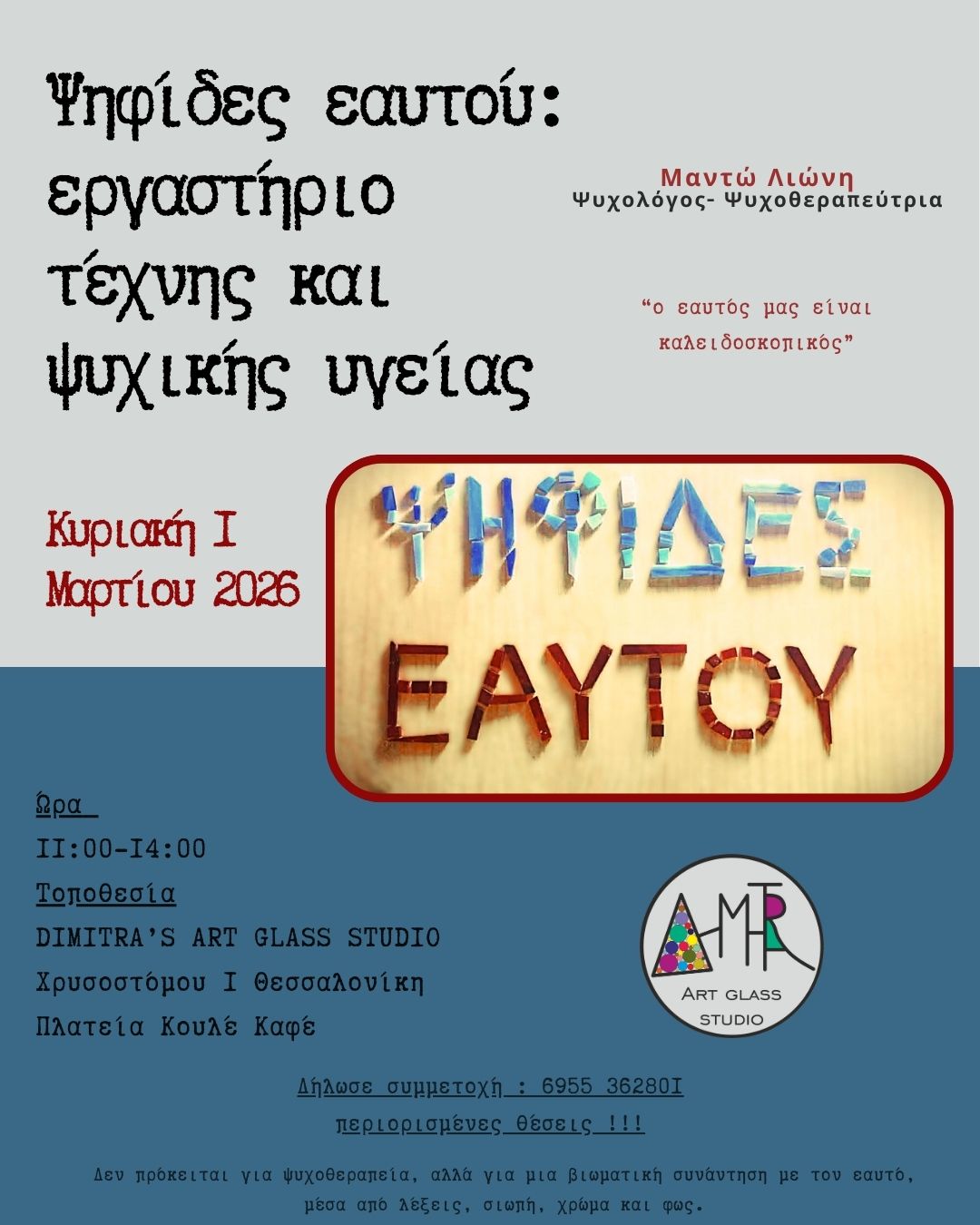 Μαζί με την Ψυχολόγο-Συστημική Ψυχοθεραπεύτρια Μαντώ Λιώνη, σας προσκαλούμε να ανακαλύψετε κομμάτια του εαυτού σας μέσα από τη δημιουργία ψηφιδωτού. Κάθε συμμετέχων θα δουλέψει με χρώμα, σχήμα και υφή, εκφράζοντας συναισθήματα, ιδέες και όνειρα – όλα σε ψηφίδες που αποτυπώνουν το προσωπικό του “μοτίβο”.